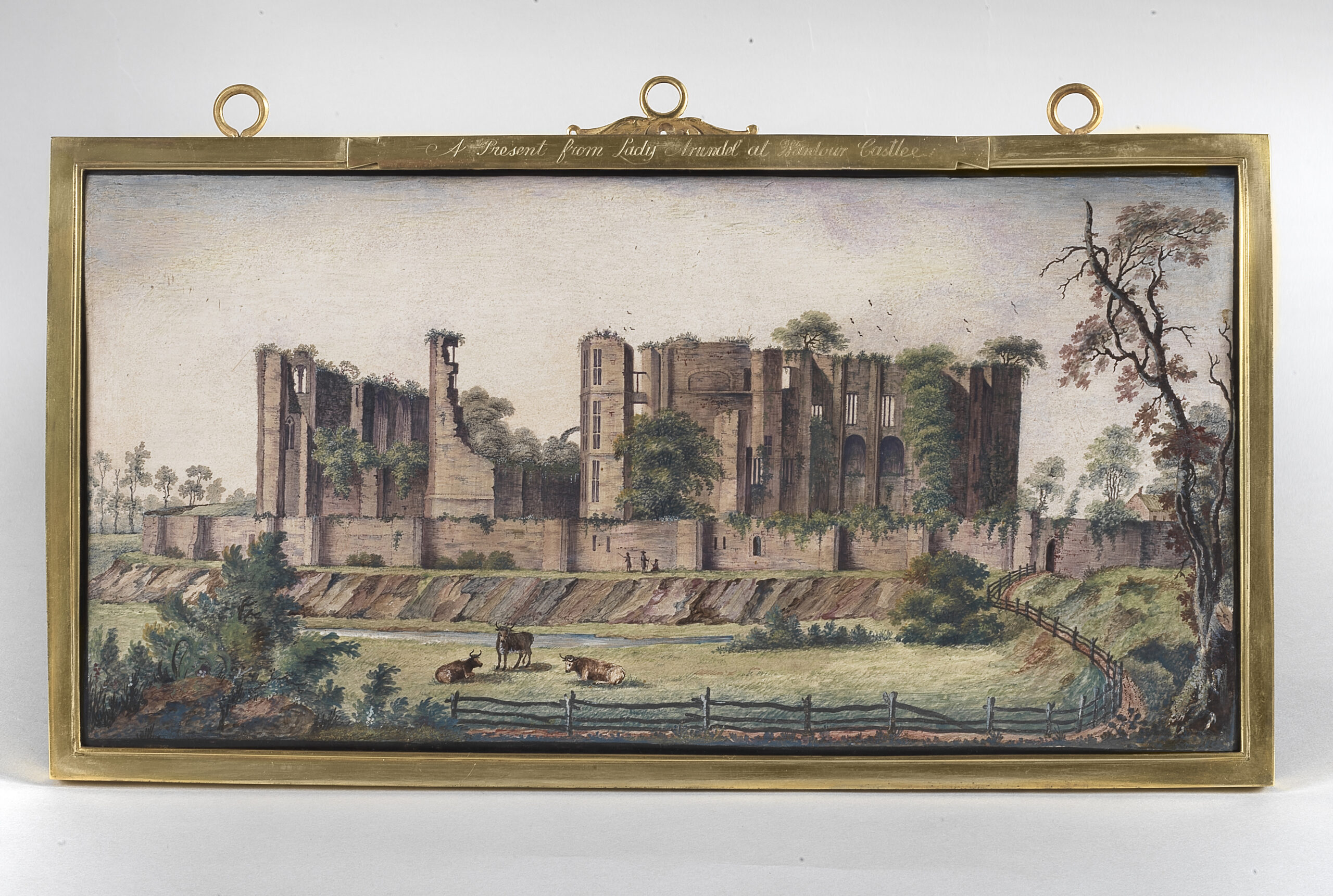 A pair or scagliola paintings portraying Kenilworth Castle and Fountains Abbey — ruins in the English countryside around which picturesque parks were developed toward the end of the eighteenth century. The inscriptions on the frame indicate that they were important gifts given by “Lady Arundel at Wardour Castle.”